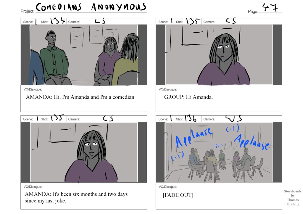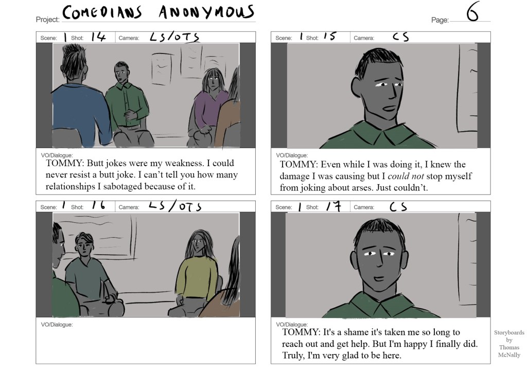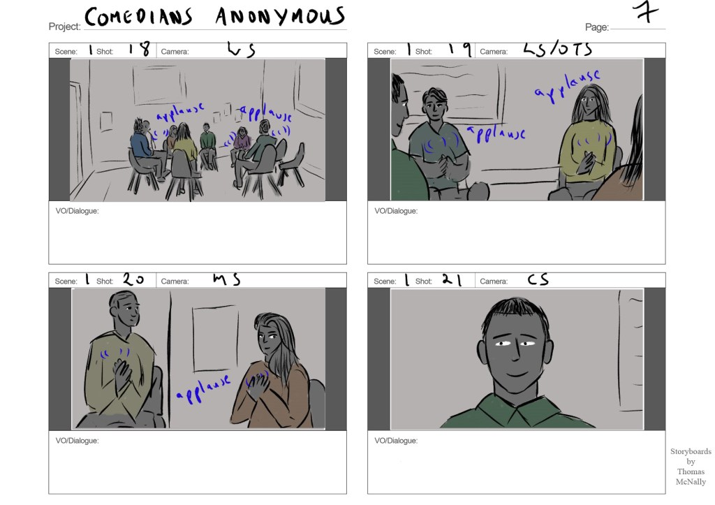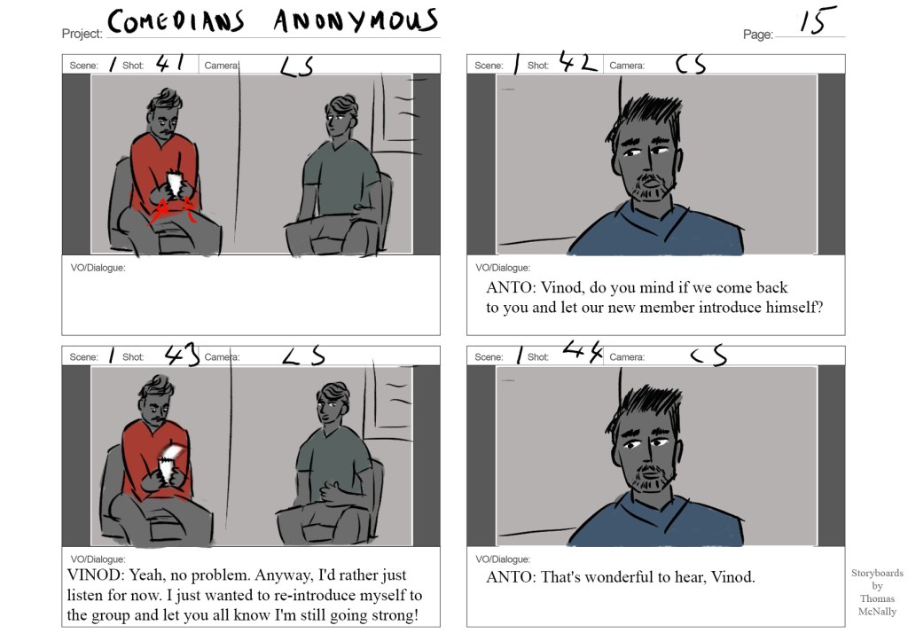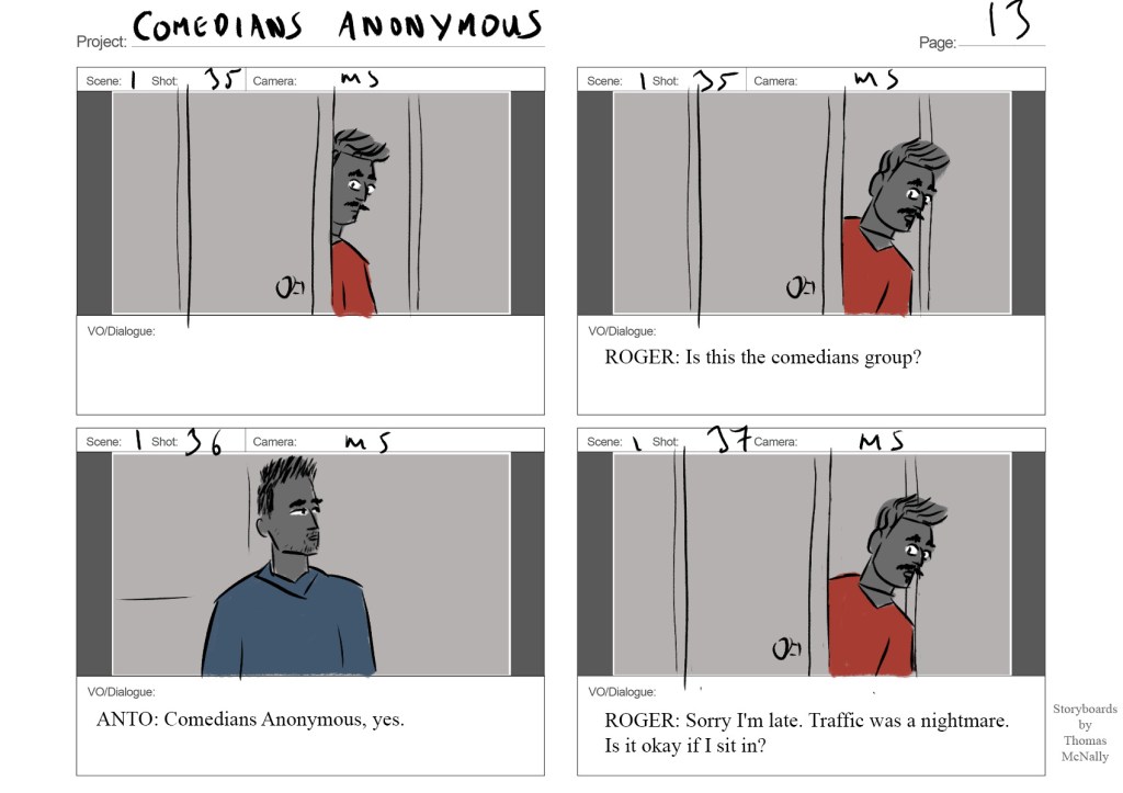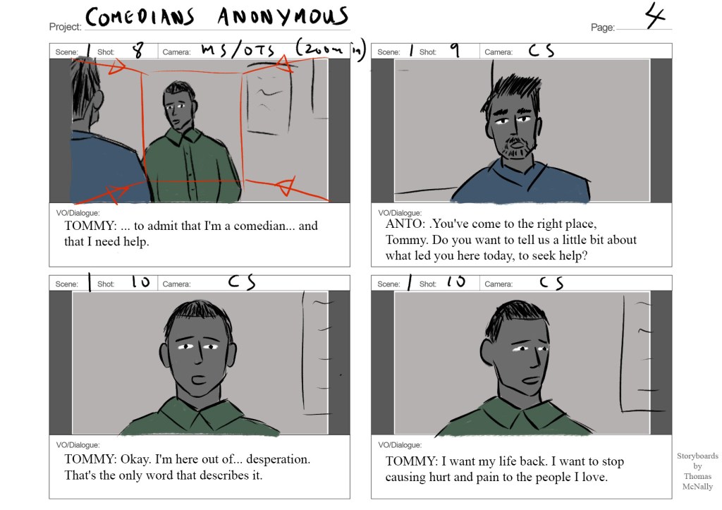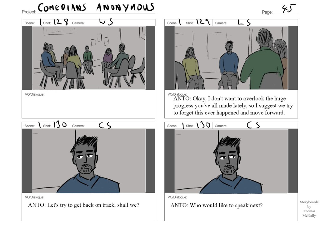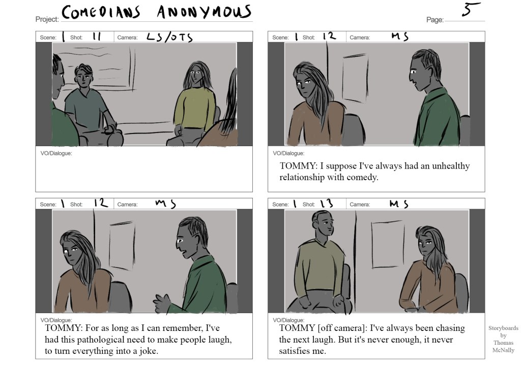 Storyboards for ‘Comedians Anonymous’ (live action short film by Thomas McNally):