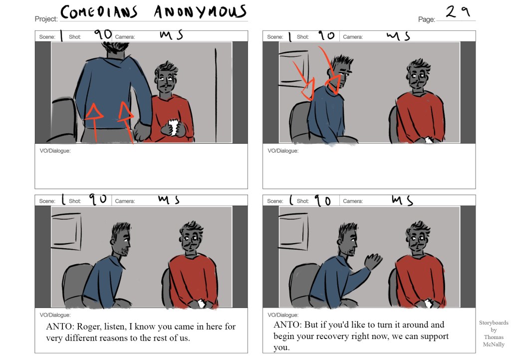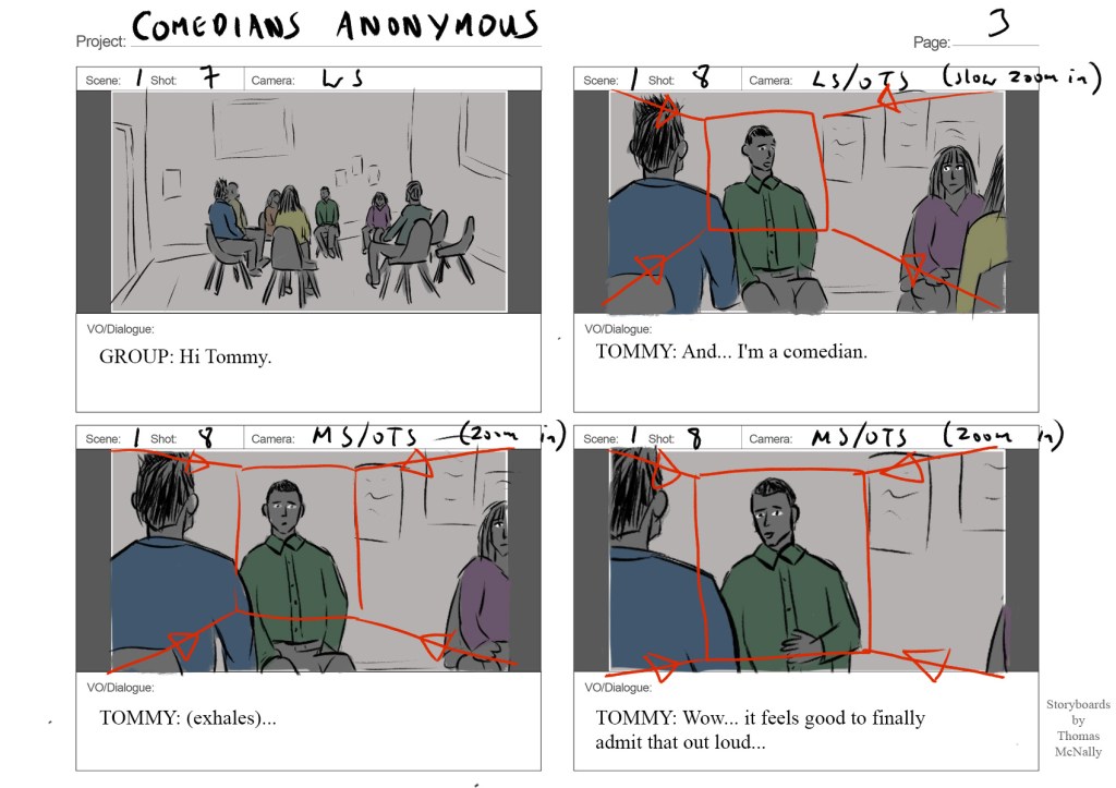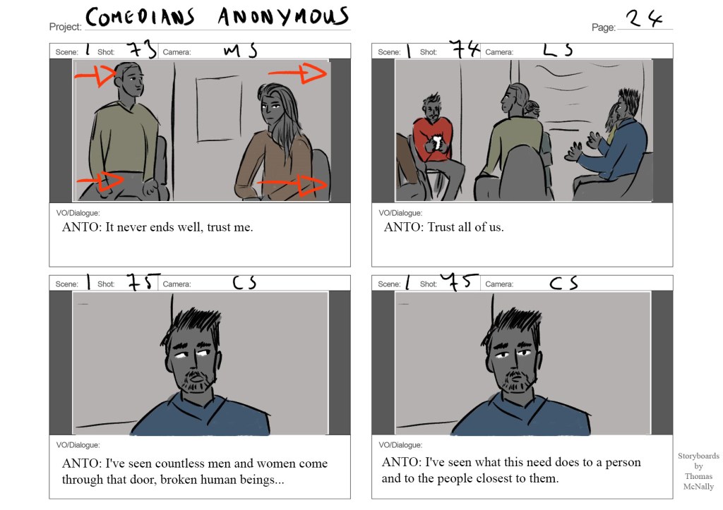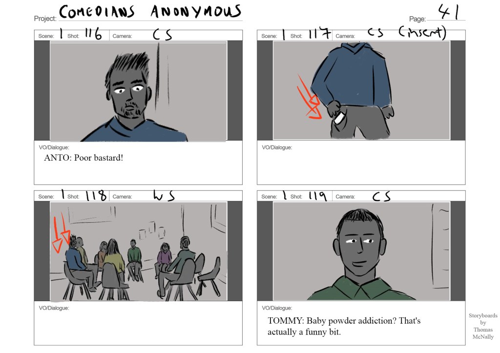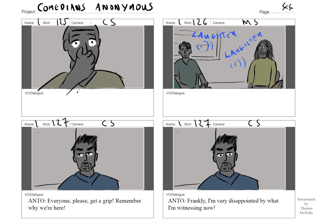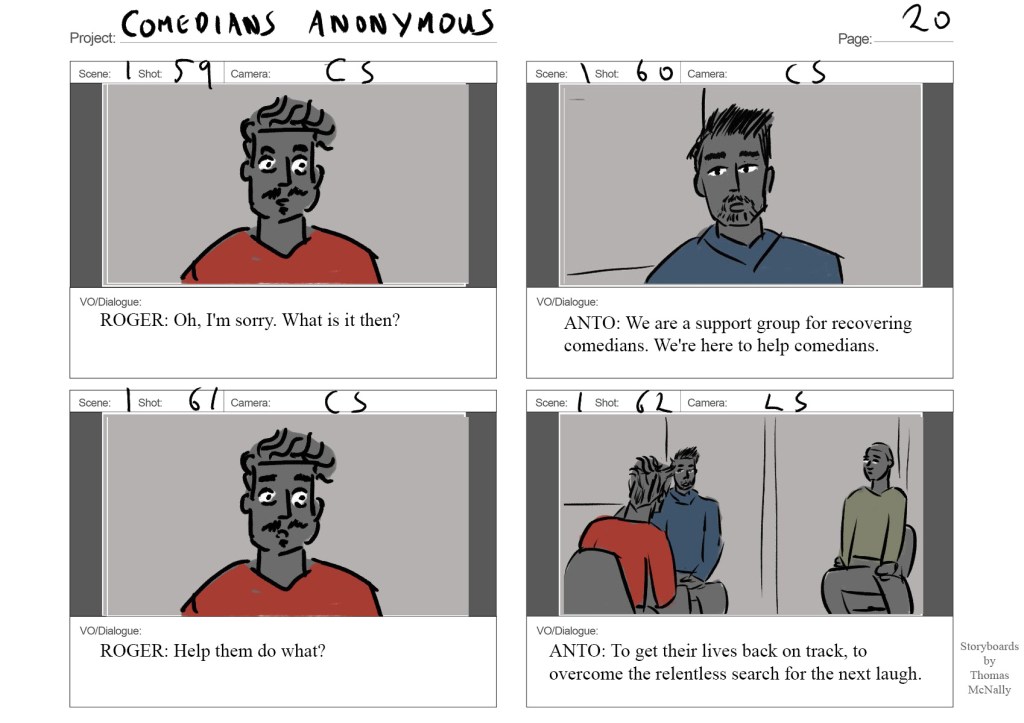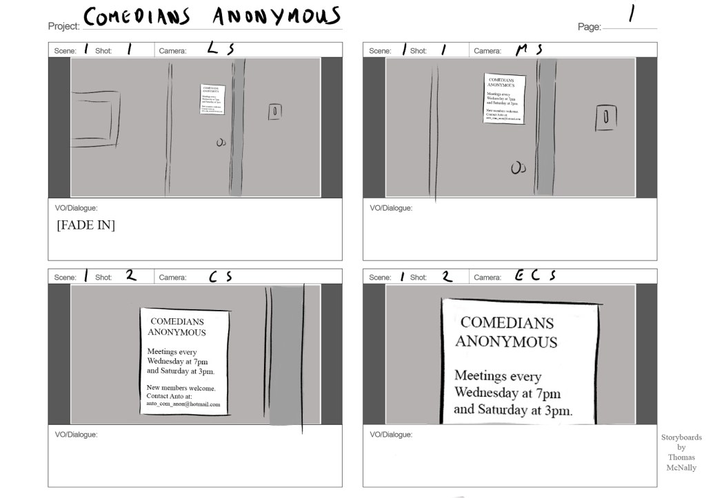 Storyboards for ‘Comedians Anonymous’ (live action short film by Thomas McNally):