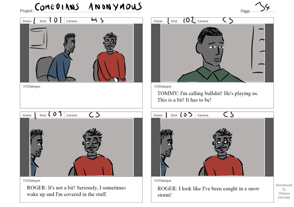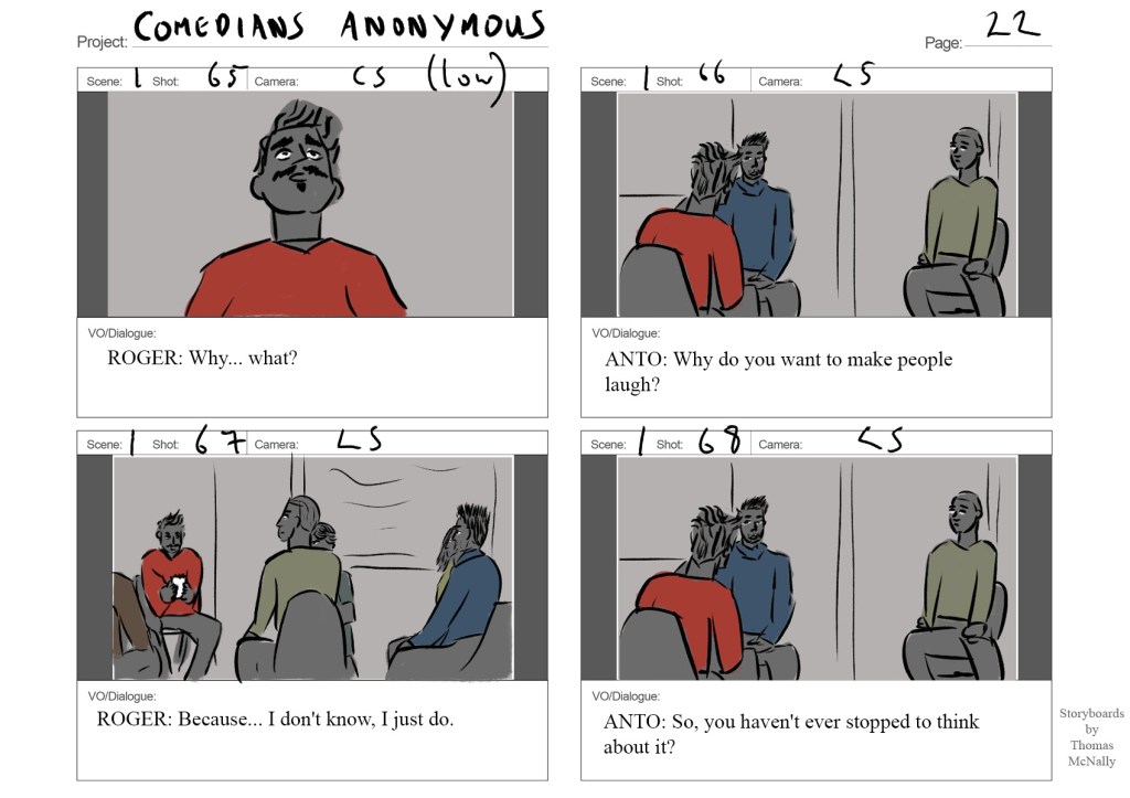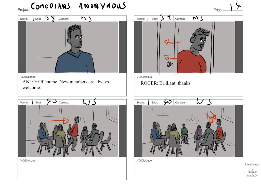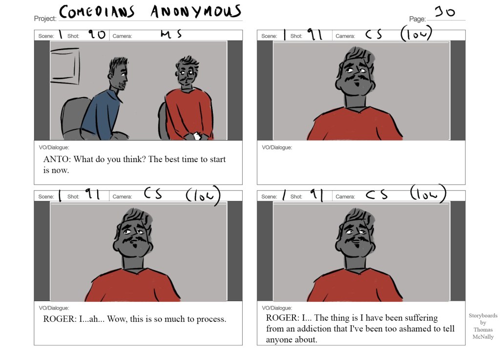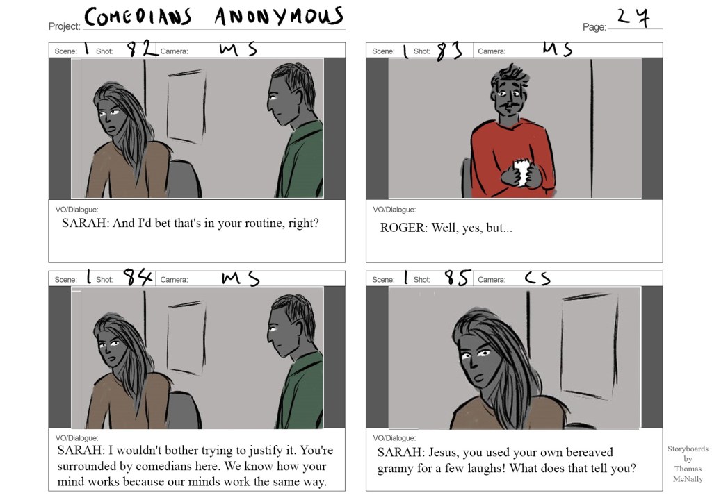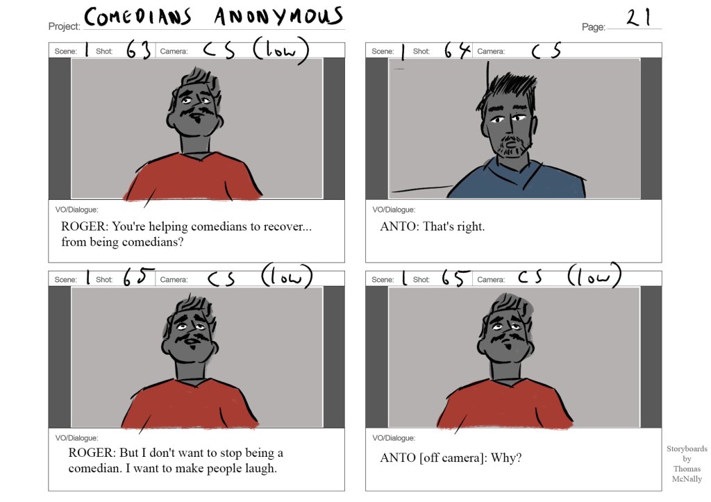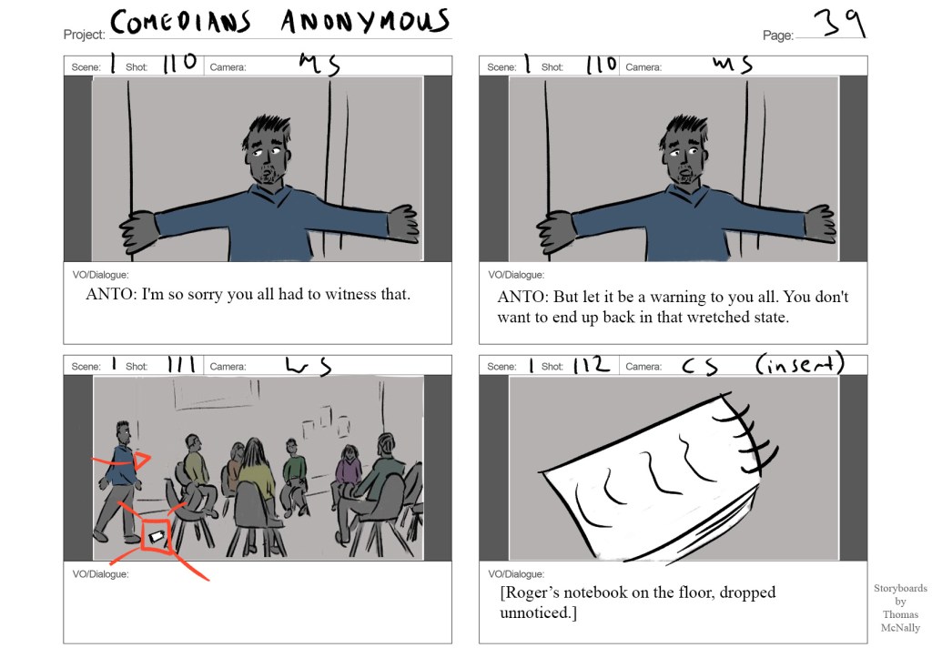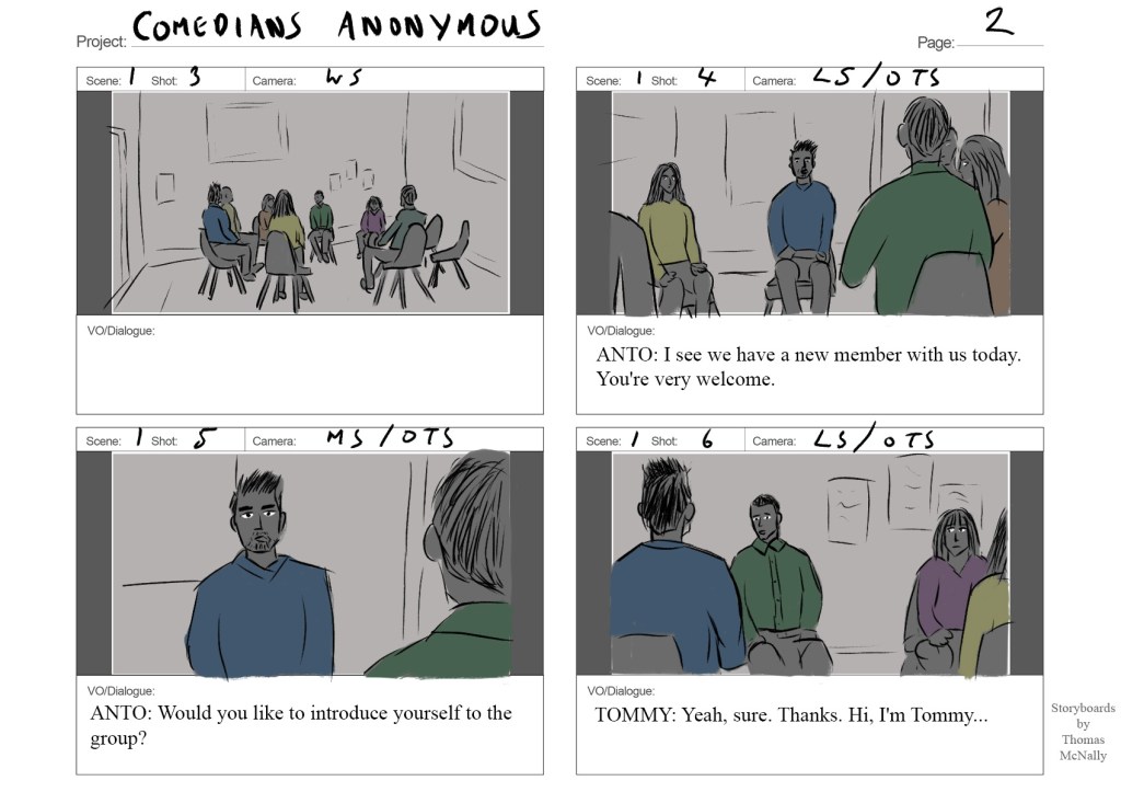 Storyboards for ‘Comedians Anonymous’ (live action short film by Thomas McNally):