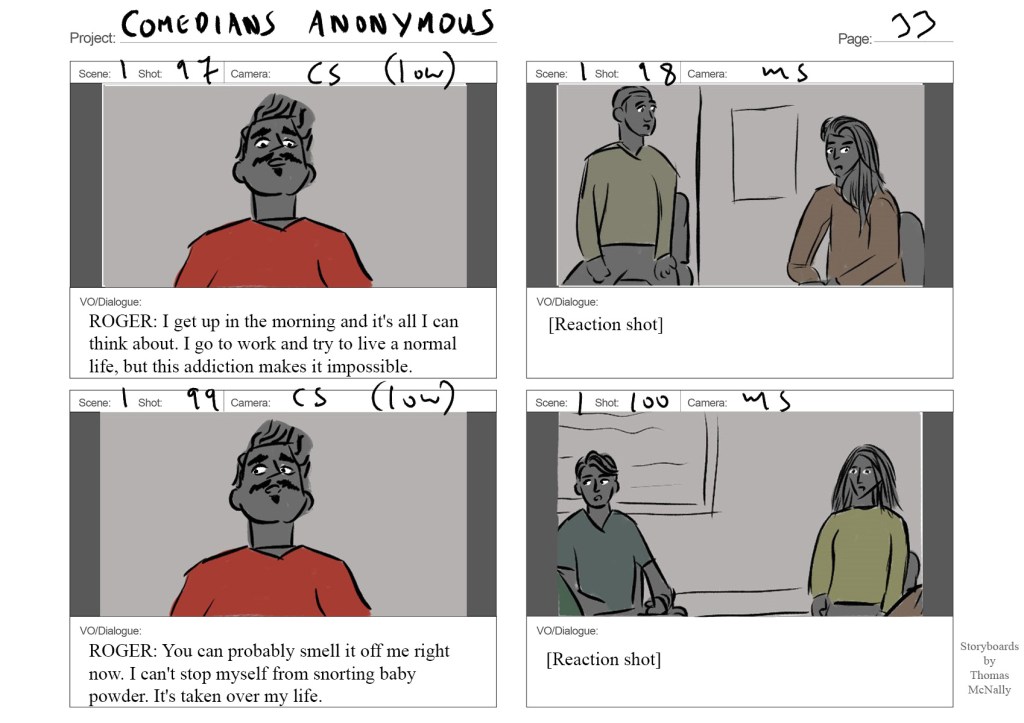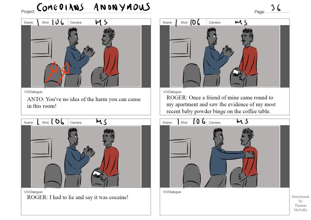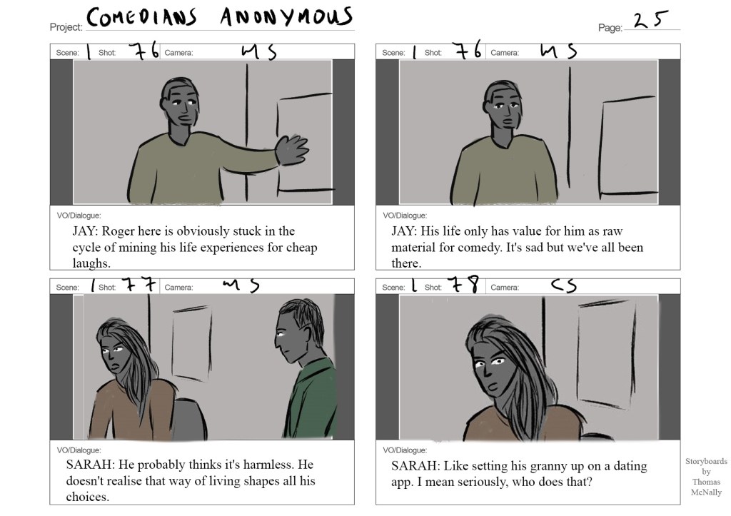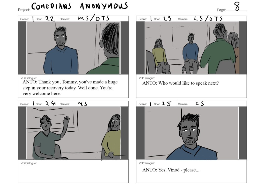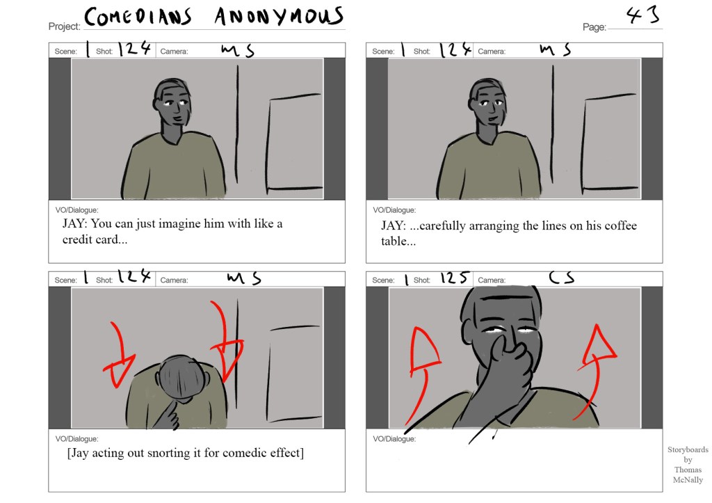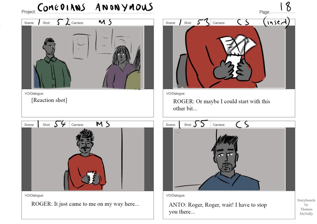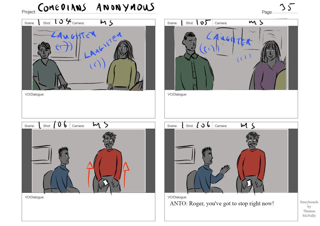 Storyboards for ‘Comedians Anonymous’ (live action short film by Thomas McNally):