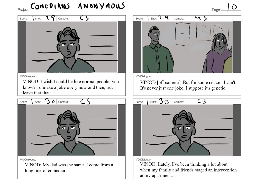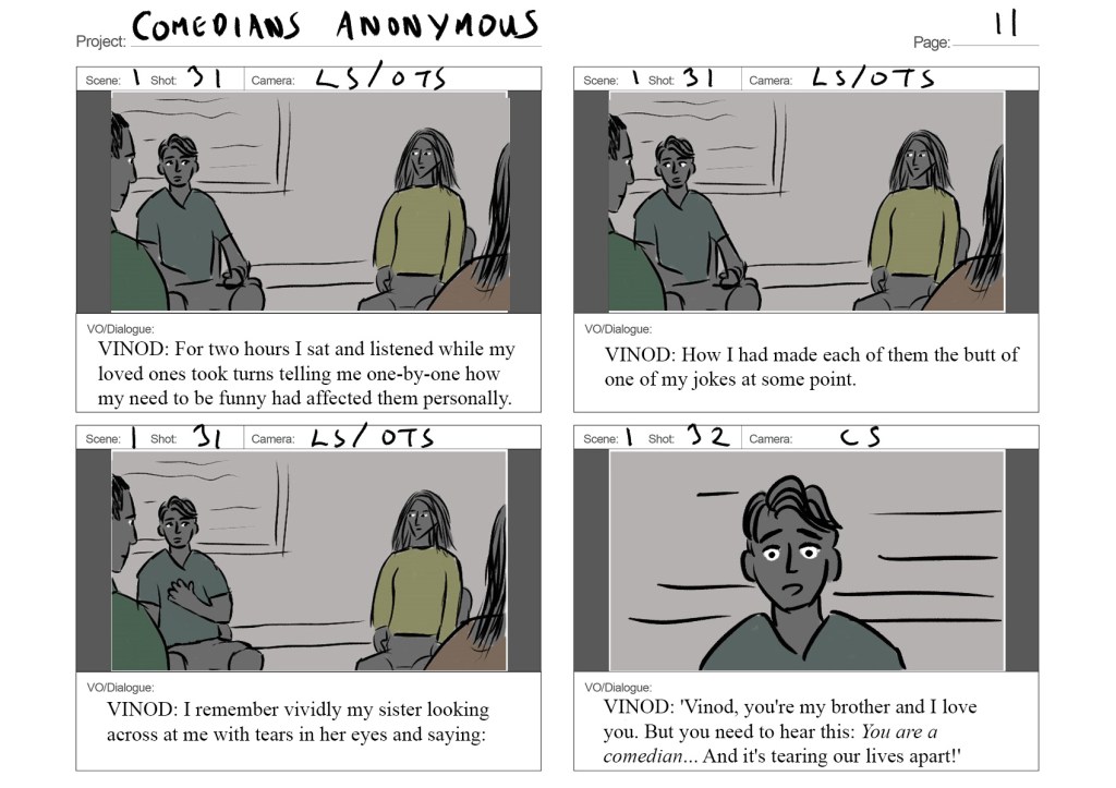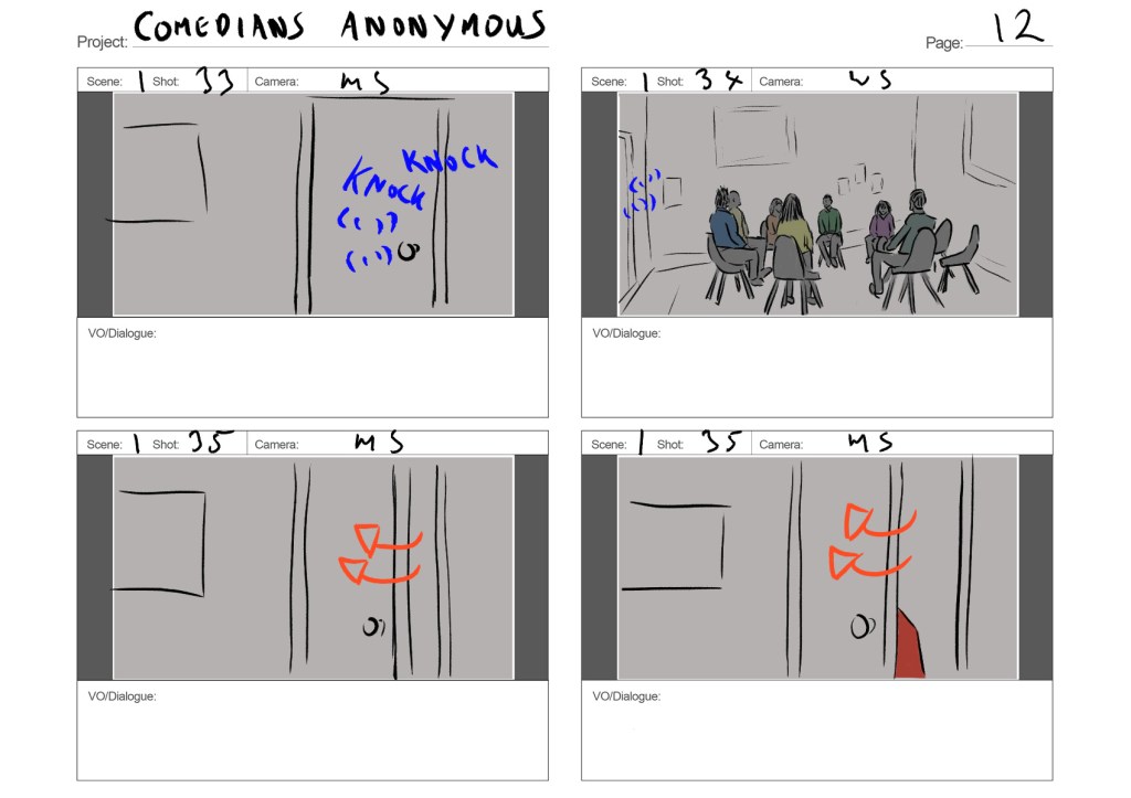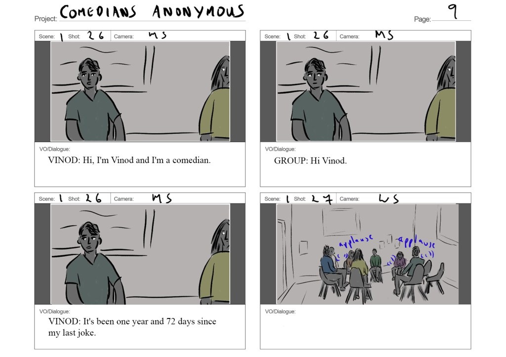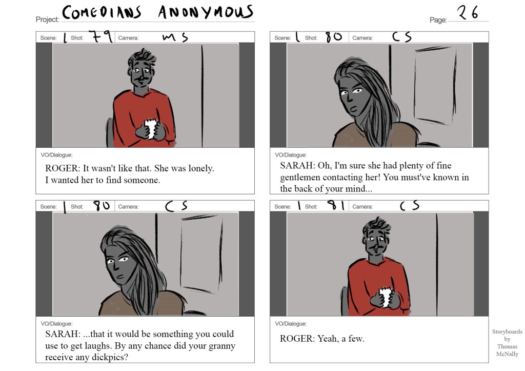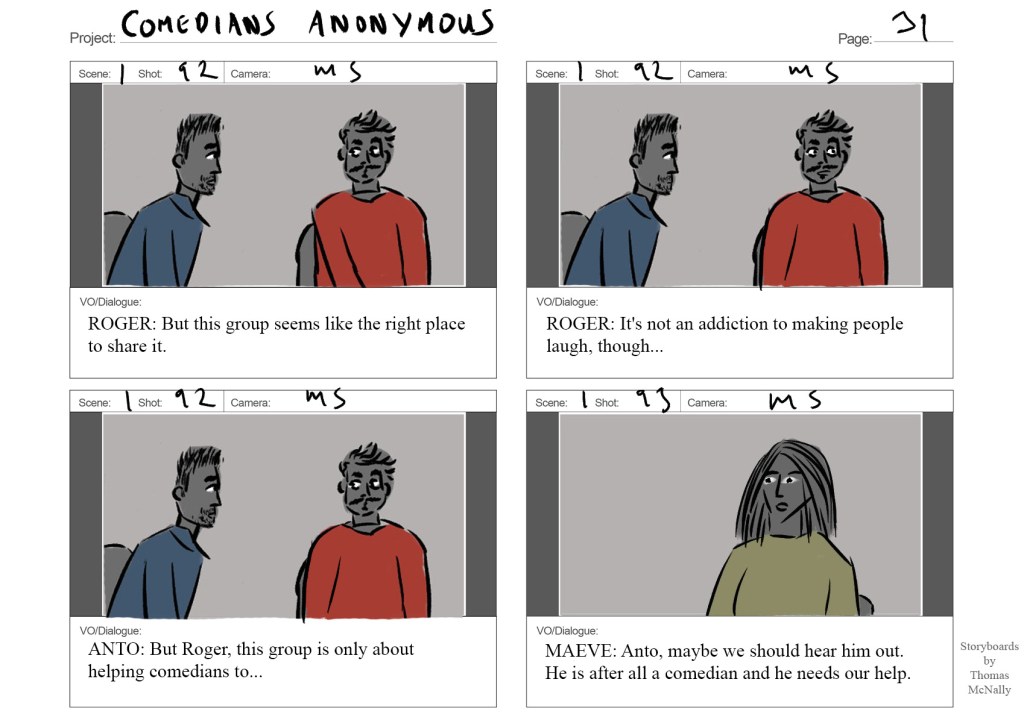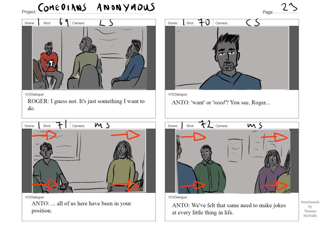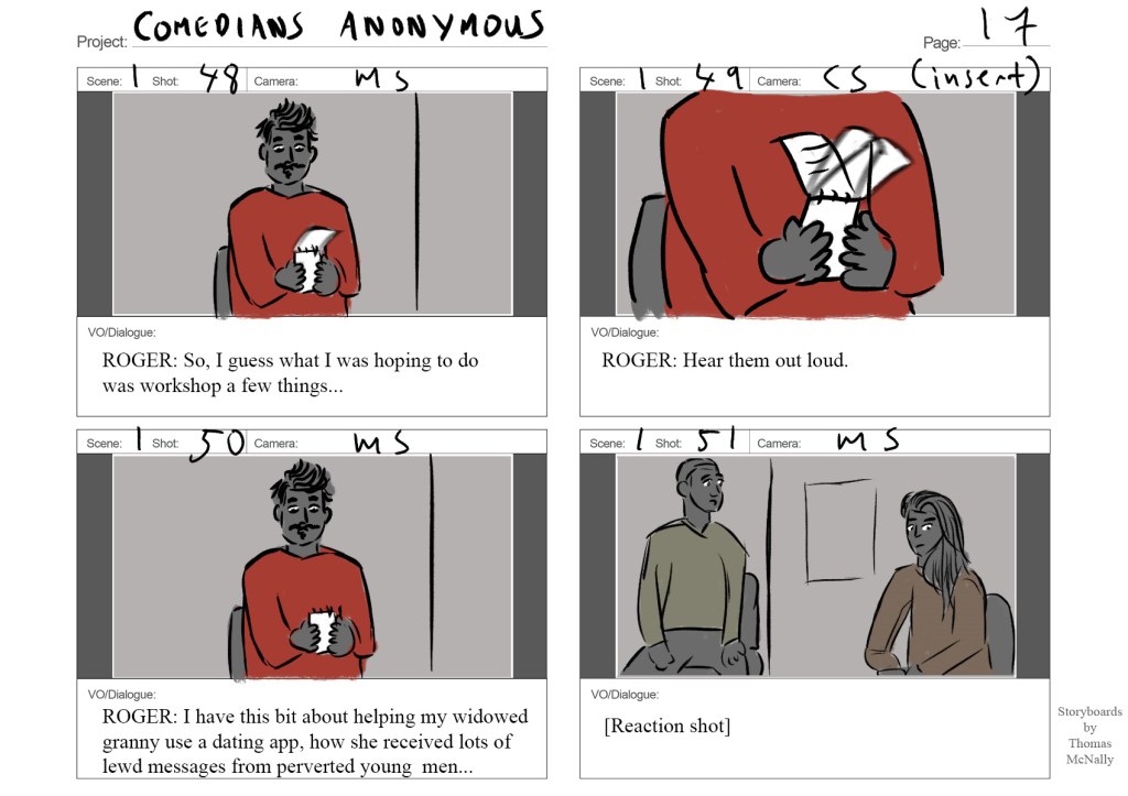 Storyboards for ‘Comedians Anonymous’ (live action short film by Thomas McNally):